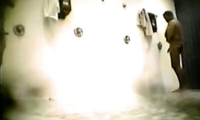 淋浴撕了惊人的下垂的牛奶罐与毛茸茸的缝隙